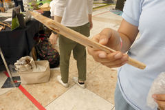 今年初めて行われたのが、家電製品を分解するワークショップとアウトドアナイフの使い方を学ぶワークショップだ。分解ワークショップは親子連れに人気で、自分達で選んだプリンターやラジカセなどを、用意された工具でどんどん分解していた。分解されたパーツは、スピーカーや基板など、種類毎に分類され、自由に持ち帰れるようになっていた。ブッシュクラフトスペシャリスト川口拓氏による、ナイフワークショップは、伐採した木の枝を二つに切り、表面の皮を剥いで先端をとがらせ、ペグを作るというもので、こちらは子どもから大人までさまざまな年齢の方が参加していた。講師の川口氏は、本格的なナイフを用いるので、正しいナイフの使い方を丁寧に指導していた。