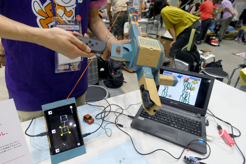 Scratch界の大御所である阿部和広氏が個人で出展しているブースでは、ニンテンドーラボのToy-ConガレージとScratchをいぬボード経由で連携させるデモを行っていた。Toy-Conの釣り竿を動かして、Scratchの画面の中の魚を釣り上げるというデモだが、アイデア次第でいろんなことができそうだ。