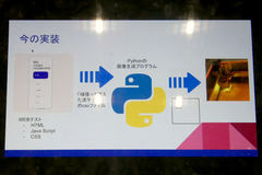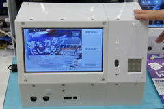 未踏ジュニアのブースでは、2017年度の未踏ジュニアに選ばれた、矢野礼伊さんと中筋絢香さんのプロジェクトが展示されており、本人達が説明を行っていた。未踏ジュニアとは、独創的なアイデア、卓越した技術を持つ17歳以下の小中高生及び高専生を対象とした、人材発掘・育成を目的としたプログラムであり、2017年度は、11プロジェクト17人が採択された。矢野礼伊さんの「見守りフォトスタンド」は、カメラや各種センサーを搭載しており、老人宅などに設置することで、サーバーを介して随時様子を知ることができるというものだ。液晶はフォトスタンドとしても利用できるようになっていることが特徴だ。中筋絢香さんの「暗記クッキー」は、スマホアプリの漢字クイズで覚えた漢字をクッキーにレーザーカッターで焼き、暗記のモチベーションを高めるというシステムだ。