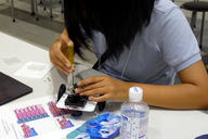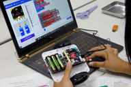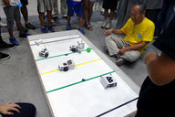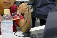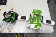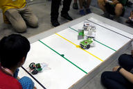 「Make: Classroom」では、さまざまなワークショップやセミナーが行われていたが、中でも人気を集めていたのだが、スイッチ・エデュケーションによるワークショップ「micro:bitでロボットサッカーをしよう」である。micro:bitは、最近注目が集まっている教育向けのマイコンボードだが、Bluetoothに対応しており、micro:bitを2台使うことで、1台をリモコン、1台を受信機として利用できる。このワークショップは、micro:bitベースのロボットカーを組み立て、プログラムを転送し、外装を作って、2台1組でチームを作り、サッカーの試合を行うというものだ。ボールをうまくキープしてドリブルできるように、外装を作ることがポイントだ。参加者は12名であり、6チームに分かれて試合を行ったが、試合はなかなか白熱した勝負になり、盛り上がった。優勝チームやデザインが優れていたチームには賞品が贈られた。