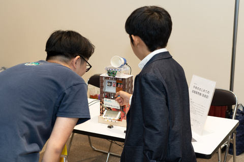 小学6年生、佐藤空汰さんの作品。自動販売機での買い物を体験できる子ども向けガジェット。販売機の前方50cm以内に近づくと買い方の説明が流れ、お金を入れるとチョコレートが買える。また、一定確率でもう一個もらえるギミックもある。