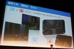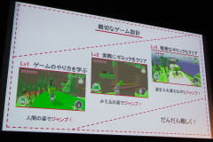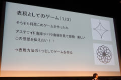 今回はオープンワールドと呼ばれる、3Dグラフィックスで描かれた広大な世界を自由に移動できるゲームを制作。遠方のオブジェクトは軽量のものに切り替える独自手法で処理負荷を減らしたこと、フィールドに興味を引くオブジェクトを配置することで自然と行動の目標ができるようにしたこと、環境音をランダムに組み合わせることでサウンドの飽きがこないようにしたことなどが説明された。