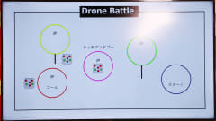 バトルでは、Ryze Tech製ドローン「Tello」とタブレットのアプリ「Tello EDU」を使い、上下左右の移動距離などを数値で制御。スタート地点の地面にドローンを置いた状態からスタートする。立てられた2つの輪をくぐると、それぞれ2ポイントと3ポイント。タッチアンドゴーで2ポイント獲得できる地上の輪がひとつあり、さらに地上のゴールの輪にドローンの足が全て入った状態で着地できれば3ポイントを獲得でゴール。得点は加点方式だ。