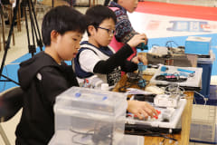会場には、専用ソフトがインストールされたパソコンとロボットのパーツが用意され、「レゴ マインドストーム EV3」や「mBot Ranger」など、4種類から自分の使い慣れたものを選んで競技できる。コースは当日発表され、「何秒進んで右に曲がる」などの進む時間を入力するほか、コースの壁や床の線をセンサーで認識して動きを制御する方法も取れるようなマップが用意されていた。攻略方法は選手が自由に選択。参加選手は「ドローンバトル」と同様に、第1~3戦の間にロボットの組み立てとプログラミングを繰り返し、練習と修正を行なっていた。