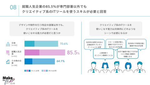 実際に、70.6%の企業が「デザインや制作の部署以外でもクリエイティブツールを使いこなせる能力が必要」と答えている。説得力のあるプレゼンテーション、社内向けの動画制作や編集、リモート営業などで分かりやすく伝えるために工夫が必要など、クリエイティブツールが扱えるスキルが必要だという認識は広がっている。