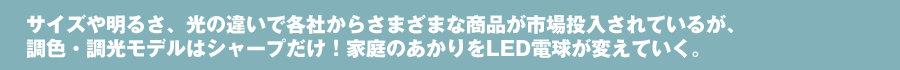 LED電球には光の色の違いで2タイプがあるが、従来の白熱電球に近いタイプの「電球色」と蛍光灯の光に近い「昼白色」が用意されている。これは競合各社もほぼ同様の商品展開を行っている。しかし、シャープではひとつの電球で電球色から昼白色、そしてその中間の色の光までコントロールできるという調色・調光モデル(DL-L60AV)、がラインナップされているのだ。これは競合メーカーにはない魅力的な商品だ。