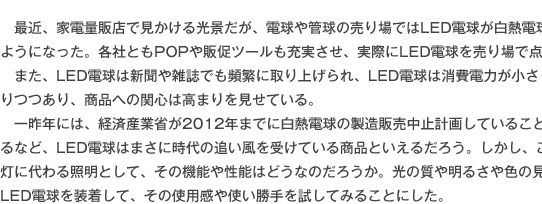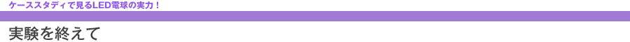 今回の実験を終えてまず感じたことは、照明としてのLED電球の光は、白熱電球や蛍光灯と比較しても長所ばかりが目についたということだ。