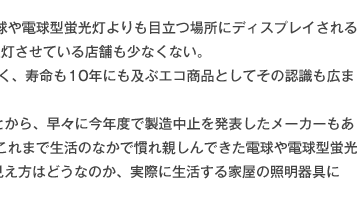 日本人は光の演出が不得意である。陰影礼賛のような伝統があるにもかかわらず。LED電球は、環境に対するやさしさや経済性で評価されがちだが、本来の魅力は、その空間の演出力にある。