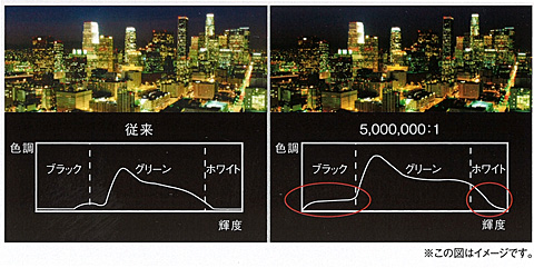 ![]() f-ENGINEとLEDバックライトの調光により、最大コントラスト比5,000,000:1を実現 |