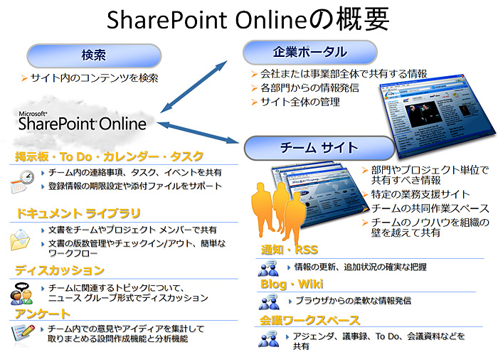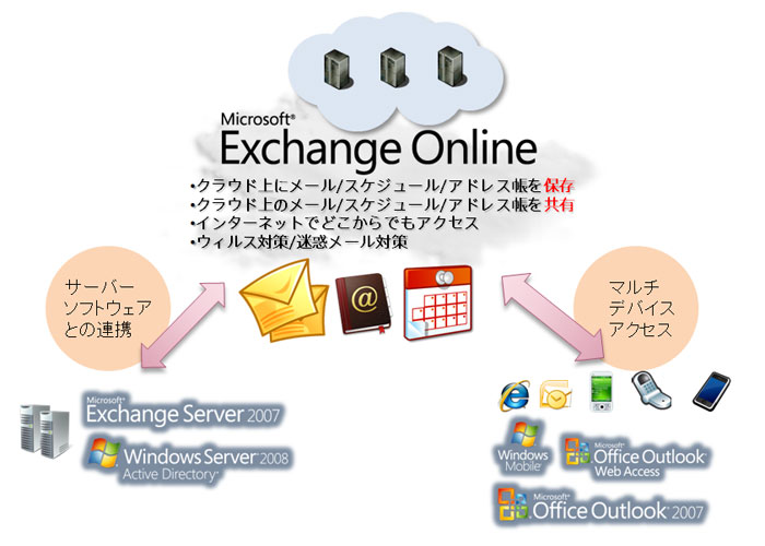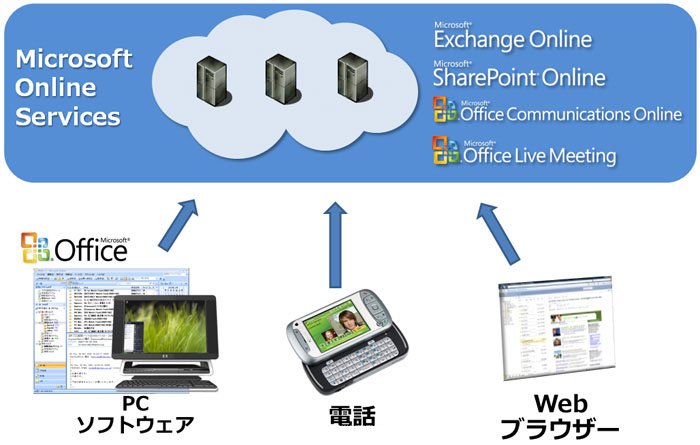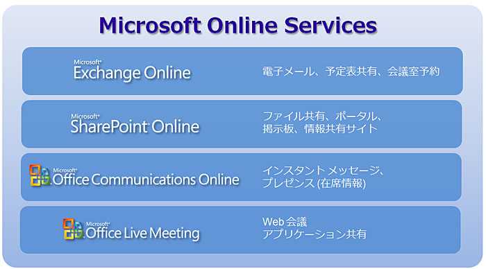 電子メールや予定表共有などはExchange Online、ファイル共有やポータルなどの情報共有としてはSharePoint Online、インスタントメッセージング(IM)機能や在席情報を提供するOffice Communications Online、Web会議やアプリケーション共有などの機能を提供するOffice Live Meetingなどが、Microsoft Online Servicesとして提供されています。