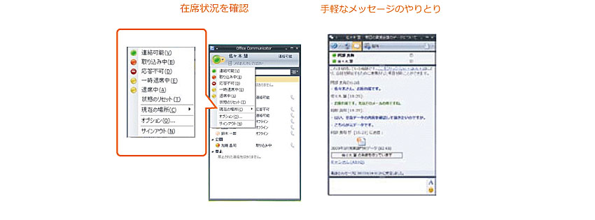 仕事に関係ないお遊びのソフトというイメージのIMも、最近では電子メールと電話の間に位置づけられるコミュニケーション ツールとして、ビジネスシーンで使われることが多くなっています。電子メールで返事をもらうほどではなく、簡単に話が終わることなら、IMの方が便利です。電話だと基本的に他の作業と同時並行で行うことは困難ですが、IMならドキュメントを作成したり、ネットで資料を探したり、読んだりしながら、返答ができます。終了したIMの内容はOutlookの専用フォルダ内に格納されていくので、IMの内容も履歴を残すことが可能です。また、在席情報が把握できることで、社員同士の連絡がよりスムーズなることは、言うまでもありません。
