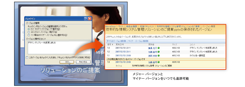 さらに、Office 2007などと連携して利用すれば、資料や文書のバージョン管理も簡単に行えます。これを利用すれば、複数のユーザーで1つの資料を作成することができます。たたき台になる最初の文書をSharePoint Onlineで公開して、ほかのユーザーに修正を入れてもらい、最終的にひとつの文書を完成させることが可能です。以前なら、紙に印刷して、各ユーザーに回覧して、赤入れをしてもらって、最後に修正をまとめるといった工程が、SharePoint Onlineを使うことで、デジタルデータのみで効率よく進みます。