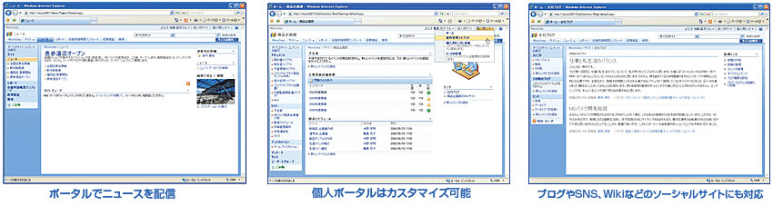 例えば、ポータル機能を使うと、社員に様々な告知をしたり、有用なニュースを届ける社内ポータルサイトを作成したりできます。情報発信の対象を社員全員や部署全員など、特定できるのが便利です。さらに、社員ごとの個人用ポータルサイトを作成することもできるので、個人が社内向けにブログを書いたり、Wikiを作成したりすることもできます。アンケートを作成して、ユーザーからの回答を集計することも可能です。