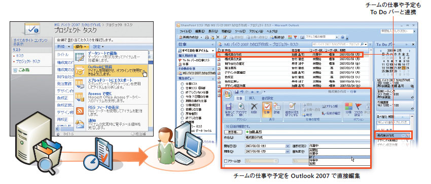 また、複数のユーザーで使用できる予定表、プロジェクト タスク リストでプロジェクトの進捗状況を管理する機能も用意されています。予定表やタスク、連絡先などの機能は、ブラウザーを使用しなくても、Office Outlook 2007から直接、参照・編集が可能です。