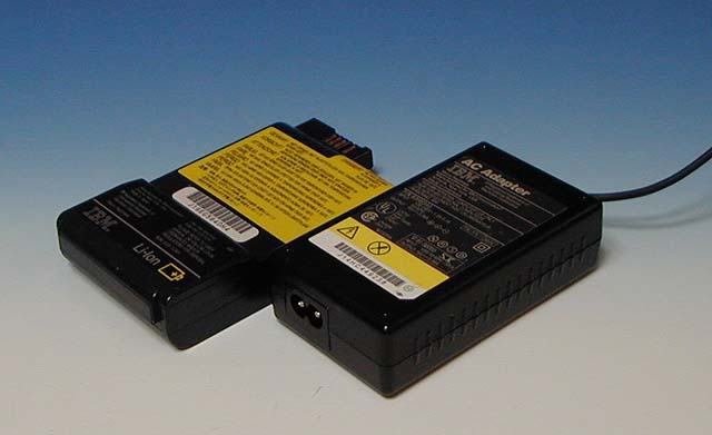 ノートパソコンモバイラーには必須の予備のバッテリーと予備のACアダプタ。愛機のThinkPad 600用のもの |