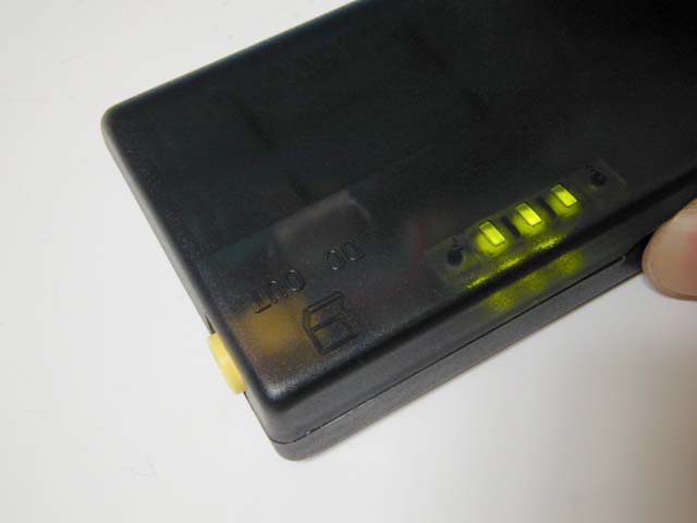 インジケーターランプは以前の「色による表示」から「3段階のランプ」になり、残量の目安がよりわかりやすくなった。しかも、少しでもノートパソコン用に電力を廻すため、横のスイッチを押したときだけランプがつき確認できるという仕様になっている。