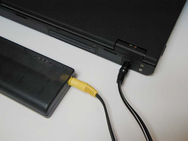 パワーバッテリー自体は一言でいうと、ノートパソコン用の外付け用バッテリーである。形状は細長い板のような形をしており、この中にリチウムイオン電池と種々の回路が入っている。あとはACとノートパソコンとの接続ケーブルだけというシンプルな構成だ。