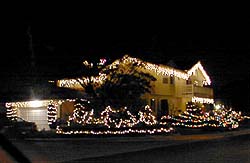この時期、ここシリコンバレーはもうクリスマス一色。週末ともなると、これみよがしに大きなクリスマスツリーを屋根に積んだ車が行き交い、お父さんは電飾で家をキラキラに飾りたてる(写真)。