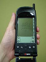 そんな中、Sprint PCSでは、最近インターネット接続が可能だということを売りにした携帯電話を数機種用意して、他社との差別化を図っている(写真)。実際に日本のiモードのように電話機単体でウェブやメールに対応するものまで用意していたりするが、どれもこれもまだ日本のiモード携帯電話と比べて「洗練された」デザインとはいいがたい。しかし、中にはQUALCOMM社のpdQ smartphoneのように、Palmデバイスとセルラーフォンを合体させてしまったという巨大な携帯電話(写真)があったりして、別の意味で興味深かったりもするのであるが。