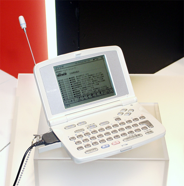 携帯電話・PHSと並び、今回のCOM JAPAN 1999で話題になったのがいわゆる「お手軽携帯情報端末」だ。従来は、NTTドコモのポケットボードに始まる一連のモバイル製品ラインアップ、シャープのコミュニケーションパルなどしか存在しなかったが、ツーカー、J-フォン、DDIポケット(Panasonic)から相次いで製品が登場し、NTTドコモからもさらに「エクシーレ」「ポケットモペラ」といった新製品が出品されていた。お手軽携帯情報端末の二回戦開幕といった様相だ。