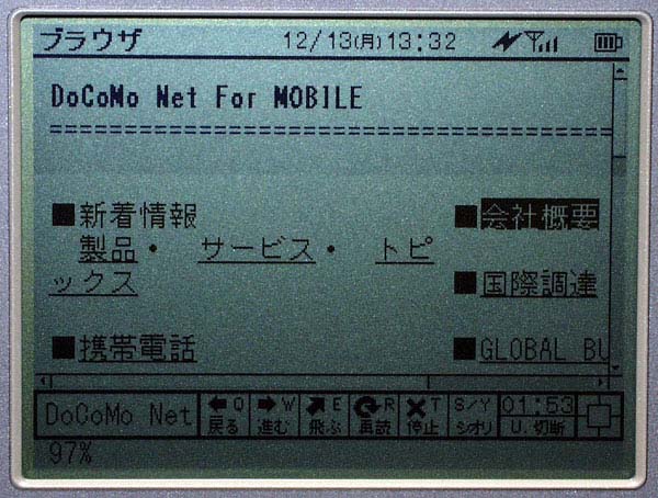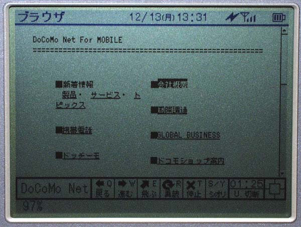 Webブラウザは、HTML3.2準拠のものが採用されている。GIF/JPEG形式の画像も表示することが可能だが、画像の読み込みをOFFに設定することもできる。ブックマークは最大60件まで登録でき、Proxyサーバも設定することが可能だ。画面サイズは2段階に切り替えることができるが、画面サイズが小さいため、通常のWebページの閲覧はやや見にくい。縮小表示でモバイル向けコンテンツを見るのがちょうどいいサイズだ。