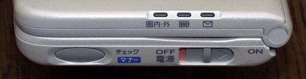 本体右側面。[チェック/マナー]ボタンを押すと、圏内・外やバッテリーのLEDが点灯する