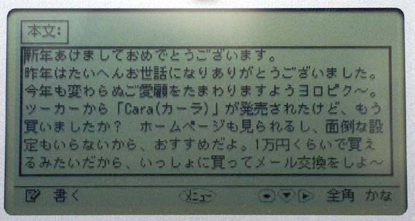 操作をし始めて、まず最初に気がついたのは動作速度の遅さだ。一般的に、こうしたメール端末は省電力やコストダウンのため、CPUが遅いものだが、Caraはポケットボード ピュアなどの他のメール端末に比べても動作が遅く感じられる。ただし、「遅くて使えない~」ということではなく、「少し遅めだね」というレベルだ。メール端末初体験の初心者なら、まず不満に感じることはないだろう。