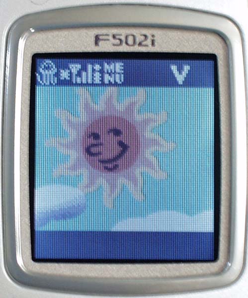 F502iの液晶ディスプレイ画面。やや青白い印象が残る