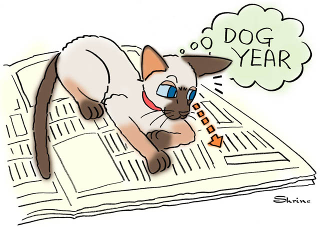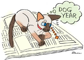 最近は漢字もかなり読めるようになったので、オイラだけで新聞を読んでいると、モバイルコミュニケーション関係の記事のところで“ドッグイヤー”なる言葉をよく見かける。これは、犬の成長が人間に比べて3倍程度速いことに由来しており、急成長を遂げるハイテク産業で良く使っているようだが、なんとなく、成り振り構わず大きくなろうと言う意味も暗に含まれているように感じる。弱肉強食のことを“Dog eats dog.”と言うが、品の良いオイラたち猫と違って犬は品の良い例えに使われないような気がする。