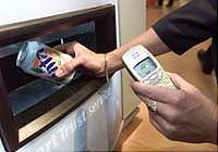 | 10月からスイスのジュネーブで開催されたTelecom'99でフィンランドのソネラがセルラーホンで購入できるソフトドリンクの自動販売機を出展していた。遊園地の幼児向け乗り物の支払にも利用できるそうだ。 |