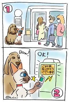 バスに乗る時、人間たちは皆セルラーホンのような物を取り出し、変な機械に向け、ボタンを押している。本来、そこには運賃を回収する機械があったはずだが、コインを入れる所が無い。代わりにセルラーホンもどきのボタンを押す度に“ご利用ありがとうございます”と表示が出る。セルラーホンもどきで運賃を払うようになっているようだ。その機械の先を見ると運転手がいない。というより、運転席そのものがない。