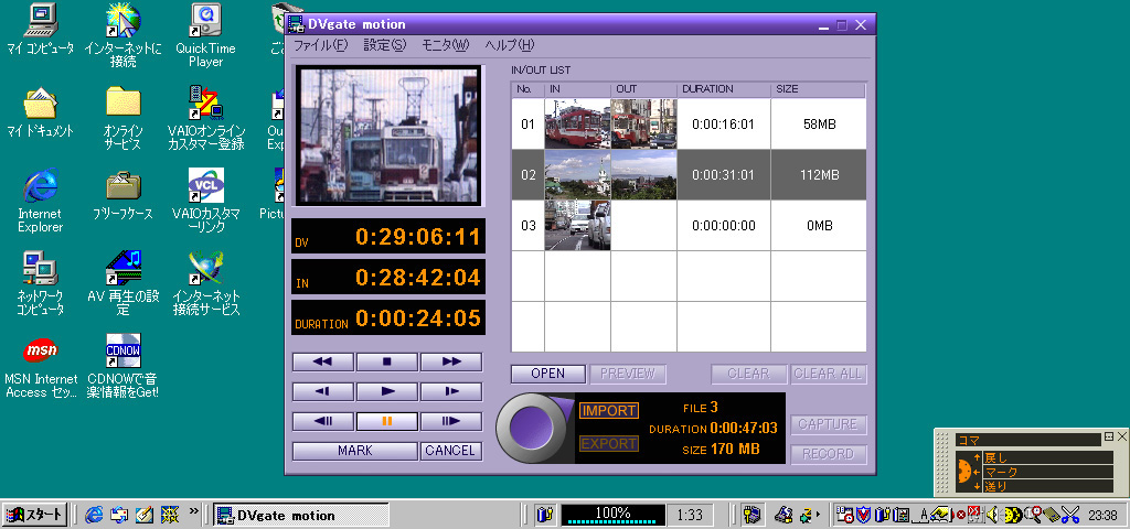 これがDVgate motionの画面。パソコンからDVカメラをコントロールしながら、取り込む範囲をビジュアルに指定できる。取り込む際にコマ落ちが発生した場合には、再度取り込み直す機能もある。C1XEで動画編集を行なうには、メモリを128MBに増設する必要がある。