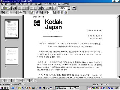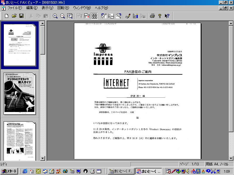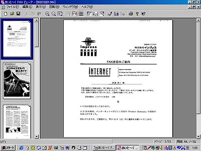 メール添付のFAXデータは、マルチページ形式のTIFFファイル、あるいはまいと~くFAX形式で保存されている。Windows98に標準で付属しているイメージングというアプレットを使えば、マルチページTIFFが表示可能だ |