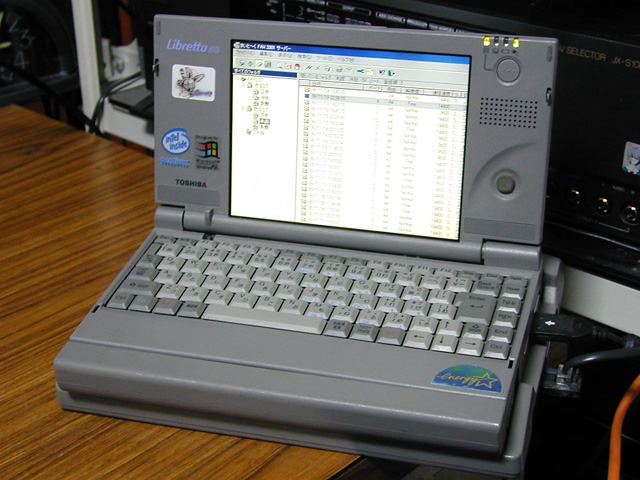現在、自宅でFAXサーバーとして、365日24時間稼働という死のロードを行っている東芝Libretto50。改造などはまったく行なっていないが、ポートリプリケーターを装着してLANカードとモデムカードを装着している。普段は蓋を閉めて棚に閉まってある |
