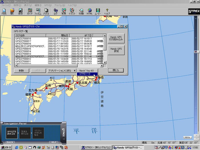ハンディGPSレシーバーに記録されたGPSログをWindows 98パソコンに読み込み、GPSログマネージャー経由でGTREXに転送する。複数のGPSログをひとまとめに結合して、新しいGPSログを生成することも可能だ