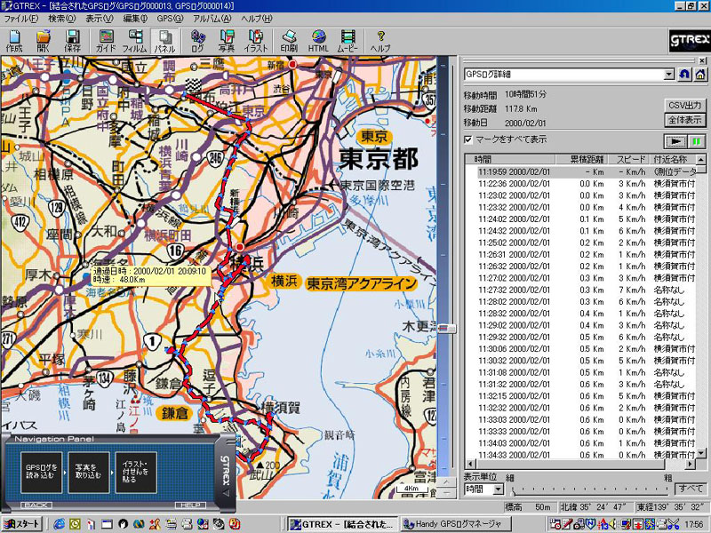 GTREXにGPSログが読み込まれると、自分が行動が赤い軌跡で地図上に表示される。GPSログ詳細を見れば、日時と場所、移動スピードなどを細かく知ることができる