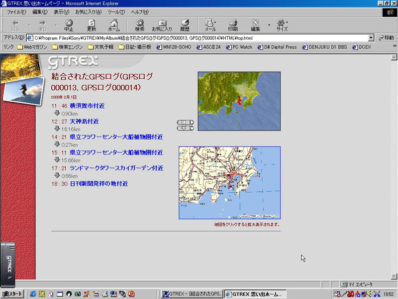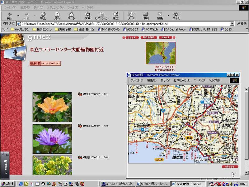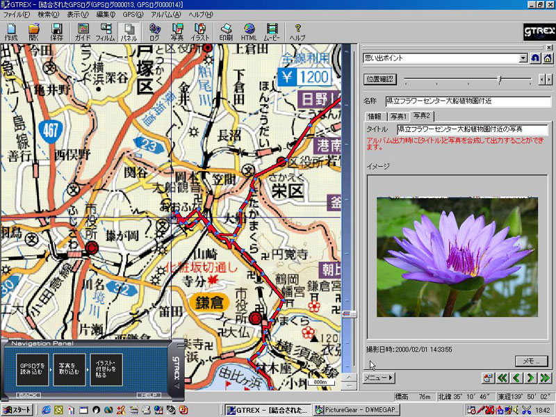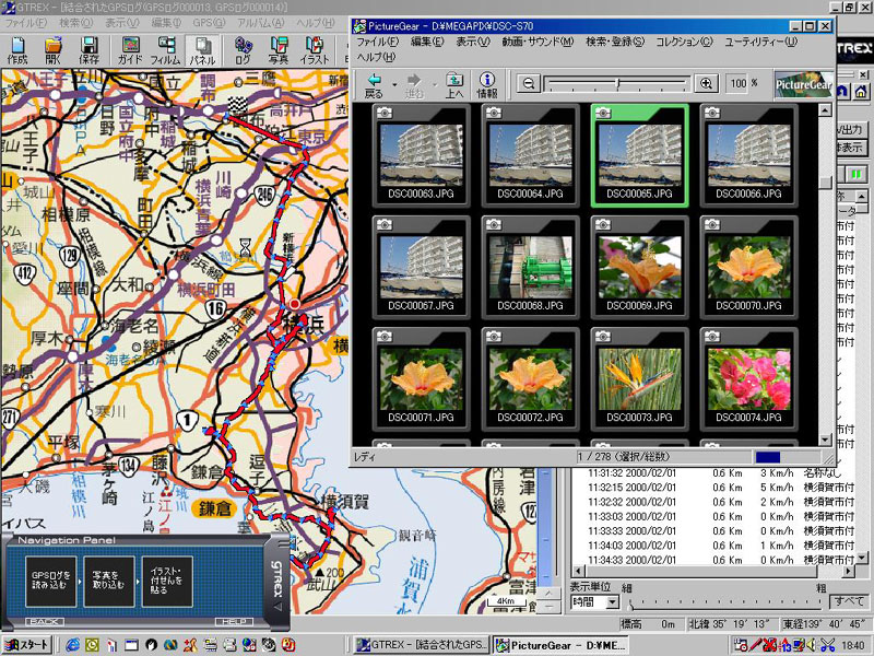 GTREXのハンディGPSレシーバーは、現状ではWindows 98環境でしか動作しないので、GPSデータの転送はWindows 98で行なう必要があるが、GTREXのアプリケーションはWindows 2000でも動作するので、どうしても300万画素オーバーのデジカメを最大解像度で使いたいという人はお試しあれ。