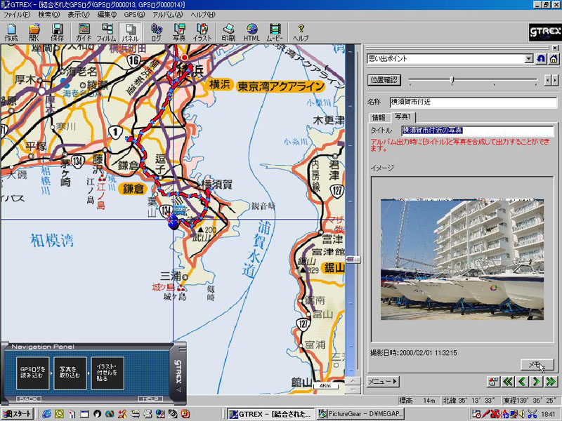 ログマネージャーでGPSログを選択し、「アプリケーションに送る」をクリックして、GTREXに転送する。すると、GTREXの地図上に、自分が動いた足跡が赤い軌跡として表示される。あとはDCF規格対応のデジタルカメラで撮影した写真(画像ファイル)をGTREXの地図上にドラッグ・アンド・ドロップすれば、撮影日時とGPSログを照らし合わせ、地図上の撮影地点に写真が自動的に貼り付けられるのだ。こうしてGTREXに貼り付けた写真は、地図や移動行程と一緒にプリントしたり、ホームページとして出力できる。