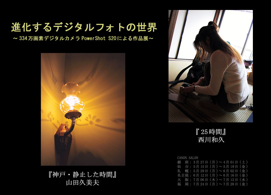 『進化するデジタルフォトの世界 -334万画素デジタルカメラPowerShot S20による作品展- 「神戸・静止した時間」山田久美夫 / 「25時間」西川 和久』と題し、3月27日(月)の東京銀座を皮切りに、仙台、札幌、名古屋、大阪梅田、福岡の各キヤノンサロンで写真展を開催することになった。
