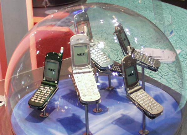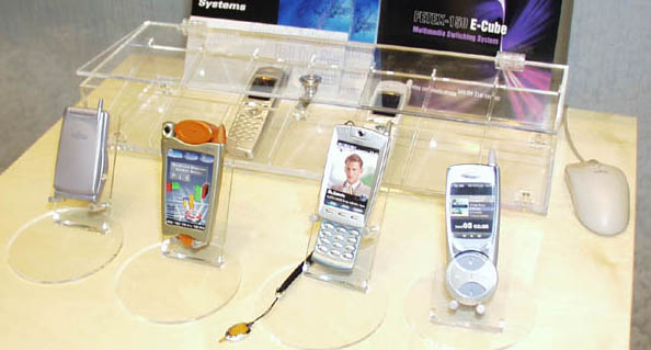 この他の国内メーカーではNECと富士通などが出展していた。NECは日本で販売するN502iやエクシーレなどを展示するほか、GSMエリアで販売する同じ折りたたみ式モデル「DB5000」「DB6000」、そしてW-CDMA向けのVideoPhoneを出品していた。ちなみに、DB5000/6000はいずれもWAPに対応している。次世代携帯電話でヨーロッパ市場の本格参入を狙う富士通は、W-CDMA向けのモックアップなどを展示し、来場者にアピールしていた。NECでも富士通でもW-CDMA向けモデルに人気が集まっていたことは言うまでもない。