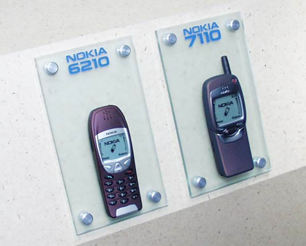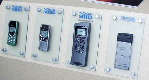 まず、NOKIA 6210は96×60ドット表示が可能な液晶ディスプレイを搭載したスタンダードなモデルで、主にビジネスマンをターゲットとしたNOKIAの主力モデルだ。これをベースに、対衝撃・耐水性能を実現したのがNOKIA 6250だ。速報でもお伝えしたように、CeBIT2000の会場でも水槽や岩の上に落とすといった手荒いデモを行なっていた。NOKIA 8890はさらに上位のモデルで、NTTドコモ向けのNM207でも採用されたご自慢のアクティブスライドを採用している。国内向けに間もなく販売されるNM502iもこれに近いデザインが採用されると予想される。