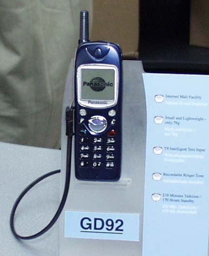 ちなみに、GD92はNTTドコモのP208とよく似たデザインを採用している。これに対し、やや角ばったデザインを採用し、WAPブラウザを搭載した新製品が「GD93」だ。90gという重量は日本向けから考えると重いが、これでもGSM携帯電話としては最も軽い部類に属する。松下電器ではこの他に、日本の展示会ではおなじみとなったW-CDMAのデモ機やモックアップなどを展示していた。なかでもカメラを内蔵したデモ機はかなり注目を集めていた。