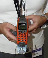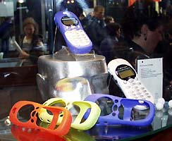 これら6機種のうち、筆者が注目した機種を2つ紹介しよう。ひとつは「TIMEPORT P1088」、もうひとつは「V2288」だ。TIMEPORT P1088はWAP/HTMLブラウザを搭載した携帯電話で、大画面の液晶ディスプレイを搭載しているのが特長だ。なかなかカッコいいデザインではあるが、カラフルで斬新なデザインを採用するGSM携帯電話の中にあっては、地味な印象が残る。対照的なのが「TIMEPORT V2288」だ。こちらは丸味を帯びたデザインを採用しているが、写真を見てもわかるように外側部分のラバー製カバーが交換できる構造が印象的だ。ちなみに、こうした『着せ替え携帯電話』は他社のブースでも見かけられた。