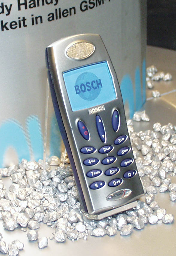 BOSCH GSM 509 DUAL サイズ:134×53×23mm。若年層を狙ったスケルトンボディの端末。着信メロディも可能