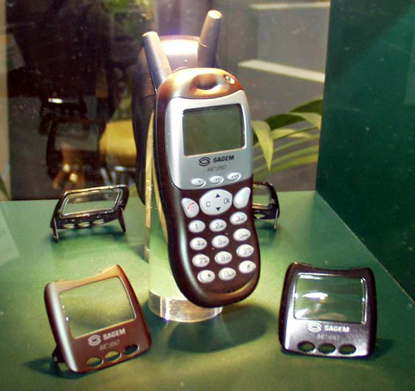 SAGEM MC950 サイズ:116.5×45.5×18.5mm、95g。液晶ディスプレイの回りの部分を交換できる着せ替えタイプの携帯電話