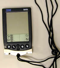 さっそく、自分のWorkPadに使ってみた。買ってきたThe BondはPalm III用のものであるが、WorkPad(30J)の形状はPalm IIIと同じなので、問題なく装着できる。がっつし合体。振り回しても大丈夫、のような気もするが、そんなことをすれば周囲の人間の頭骨にぶつかってわたしの大切なWorkPadの液晶が割れてしまうからやめた。とりあえず、首からぶら下げて歩いてみた。すると、ベルトのバックルにWorkPadがあたった。ストラップをこれ以上短くするとWorkPadが使いづらいので、伸ばしてみた。これで首から下げたままWorkPadを使えるから快適…かと思ったが、歩くと、WorkPadが絶妙な位置に物理アクセス…つまりぶつかってくる…