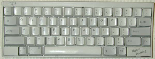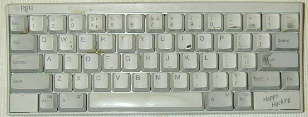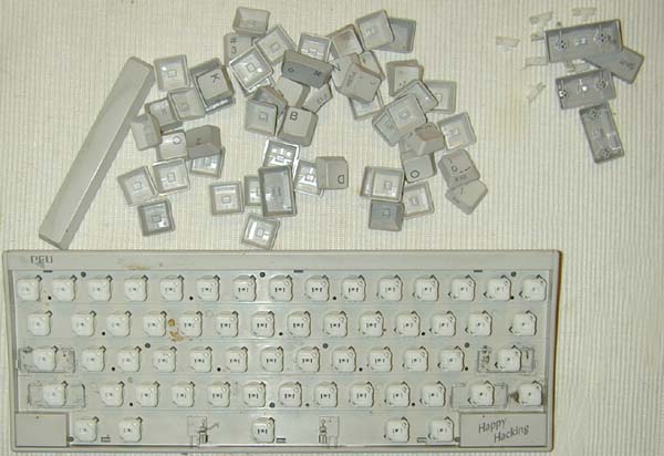 ほかの編集部員から、いらなくなったという「Happy Hacking Keyboard」をもらった。小さくて非常にかわいいキーボードである。以前紹介したHappy Hacking Cradleの日本語版が出た暁には、即効で購入してこいつをつなげたいっ、なんて思ったのであるが…非常に汚い。コーヒーをこぼしてポテチを食べた手でタイピングした上、猫がその上でごろごろしてそんな状態で245日ほど埃の多い場所に放置した、というくらい、汚れている。そんなわけで、分解洗浄した。