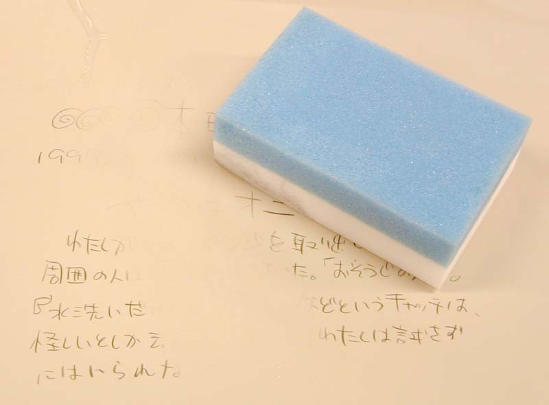 わたしがこのスポンジを取り出したとき、周囲の人は懐疑的であった。そして何を隠そう、わたしも懐疑的であった。「おそうじの鬼」。『水洗いだけでピッカピカ』などというキャッチは、怪しいとしかいえない。見たところ、ただのスポンジだ。しかしわたしは試さずにはいられなかった。まず、紙コップに注がれた水に注意深くおそうじの鬼を浸す。そしておもむろにデスクの綺麗な表面に油性鉛筆で文字を書く。この鉛筆はクレヨンのような素材なので、なかなか消えない。強引に消しゴムで消そうとすると、消しゴムも机も真っ黒になってしまう。また、普通のスポンジで水拭きしても、びくともしない。