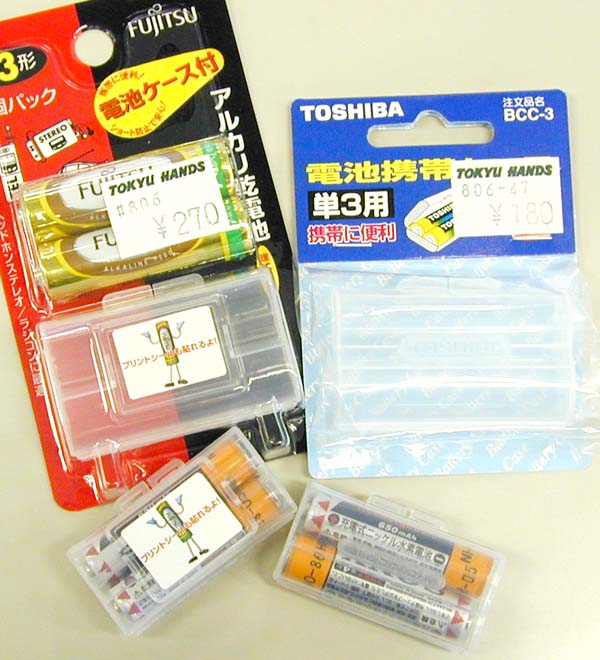 そんなことにならないためにも、電池を携帯するときはこれ、電池ケース。普通の使い捨て電池はだいたい通電を防げるビニール皮膜に包まれているが、何度も使いまわす充電池にはそれはない。予備の充電池を持ち運ぶときには是非、使っていただきたい。