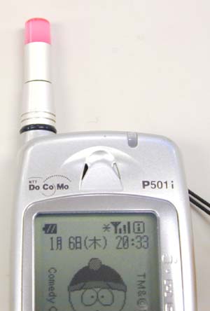 まず、このボタン。ボタンを押すと、一瞬にしてアンテナが引き出される。この機能さえあれば、とっさの電話に出るときも、一瞬にして感度最強状態にすることができる。さらに先端のLED。通信が行なわれたときだけ光るこのLEDは、iモードのような、通話してんだかどうかわかりにくいパケット通信において、パケットが飛んだ瞬間だけを感じ取ってくれる。これさえあれば「俺の知らないうちにパケットが飛ぶことはまかりならんっ」と念じている俺も、安心してiモードできる。